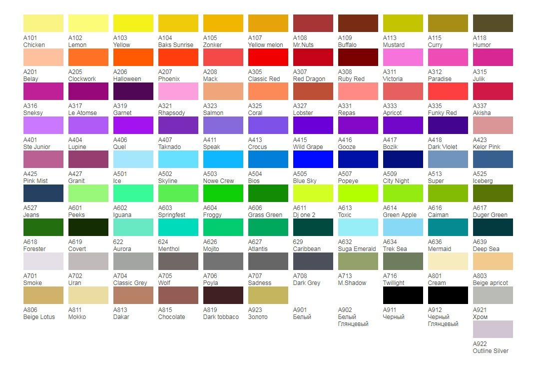 Доступные цвета: | Baby; Bios; Bozik; Buffalo; Chicken; Clockwork Crew; Cornflower; Covert; Crocus; Granit; Iceberg; Jeans; Le Atomse; Mack; Menthol; Mermaid; Military Shadow; Peeks; Phoenix; Pumpkin; Rhapsody; Salmon; Smoothie; Speak; Suga Emerald; Super; Toxic; Vanila; Бежевый Beige Apricot; Бежевый Beige Lotus; Бежевый Dakar; Бежевый Mokko; Белый Super; Белый White; Белый глянцевый White Gloss; Бледно-розовый Kelor Pink; Бронза Bronze; Голубой Blue Sky; Горчичный Mustard; Гранат Garnet; Желтый Baks Sunrise; Желтый DJ one 2; Желтый Yellow Cadmium; Желтый Yellow Melon; Желтый Zonker 207; Зеленая трава Grass Green; Зеленое яблоко Green Apple; Зеленый Cannabis; Зеленый Froggy; Золото Gold; Истинно-зеленый True Green; Коралловый Coral; Коричневый Macadamia; Коричневый Mr. Nuts; Красно-коричневый Horse; Красно-коричневый Ruby Red; Красный Classic Red; Маджента Akisha; Медь Cooper; Ментол White; Мохито Mojito; Небесно-голубой Skyline; Оранжево-красный Funky Red; Оранжевый Halloween; Оранжевый Lobster; Пастельно-оранжевый Belay; Розовый Julik; Розовый Paradise; Розовый Pink Mist; Розовый Princess; Светло-голубой Ice; Светло-зеленый Caterpillar; Светло-розовый Repas; Светло-серый Smoke; Светло-серый Wolf 745; Серо-зеленый Twilight; Серый Asphalt; Серый Classic Grey; Серый Poyla; Серый Sadness 748; Синий City Night; Синий NoWe Crew; Синий Popeye the sailor; Сиреневый Lupine; Телесный Cream 110; Темно-желтый Curry; Темно-зеленый Caribbean; Темно-зеленый Deep Sea; Темно-зеленый Forester 620; Темно-коричневый Dark Tobacco; Темно-красный Red Dragon; Темно-серый Grey dark; Утренняя заря Aurora; Фиолетовый Dark Violet; Фиолетовый Taknado; Фиолетовый Wild Grape; Фуксия Sneksy; Хаки Humor; Хром; Черный Black; Черный глянцевый Black Gloss; Шоколад Chocolate; Ярко-голубой Trek Sea Breez; Ярко-зеленый Atlantis |