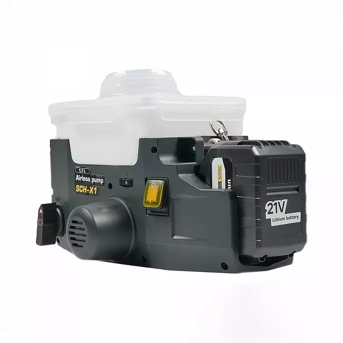 SCHTAER SCH-X1 — это мощный и мобильный аккумуляторный краскораспылитель безвоздушного типа, предназначенный для профессионального нанесения красок, эмалей, лаков и других ЛКМ на различные поверхности. Благодаря автономной работе от аккумулятора и высокой производительности, инструмент идеально подходит для строительных, отделочных и малярных работ как в помещениях, так и на открытых площадках.