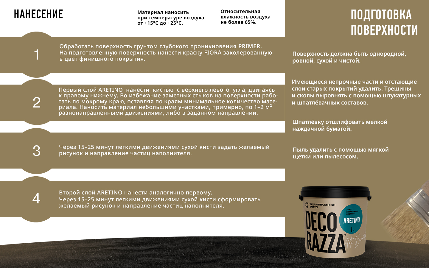 3. Первый слой Aretino нанести кистью с верхнего левого угла, двигаясь к правому нижнему. Во избежание заметных стыков на поверхности работать по мокрому краю, оставляя по краям минимальное количество материала.