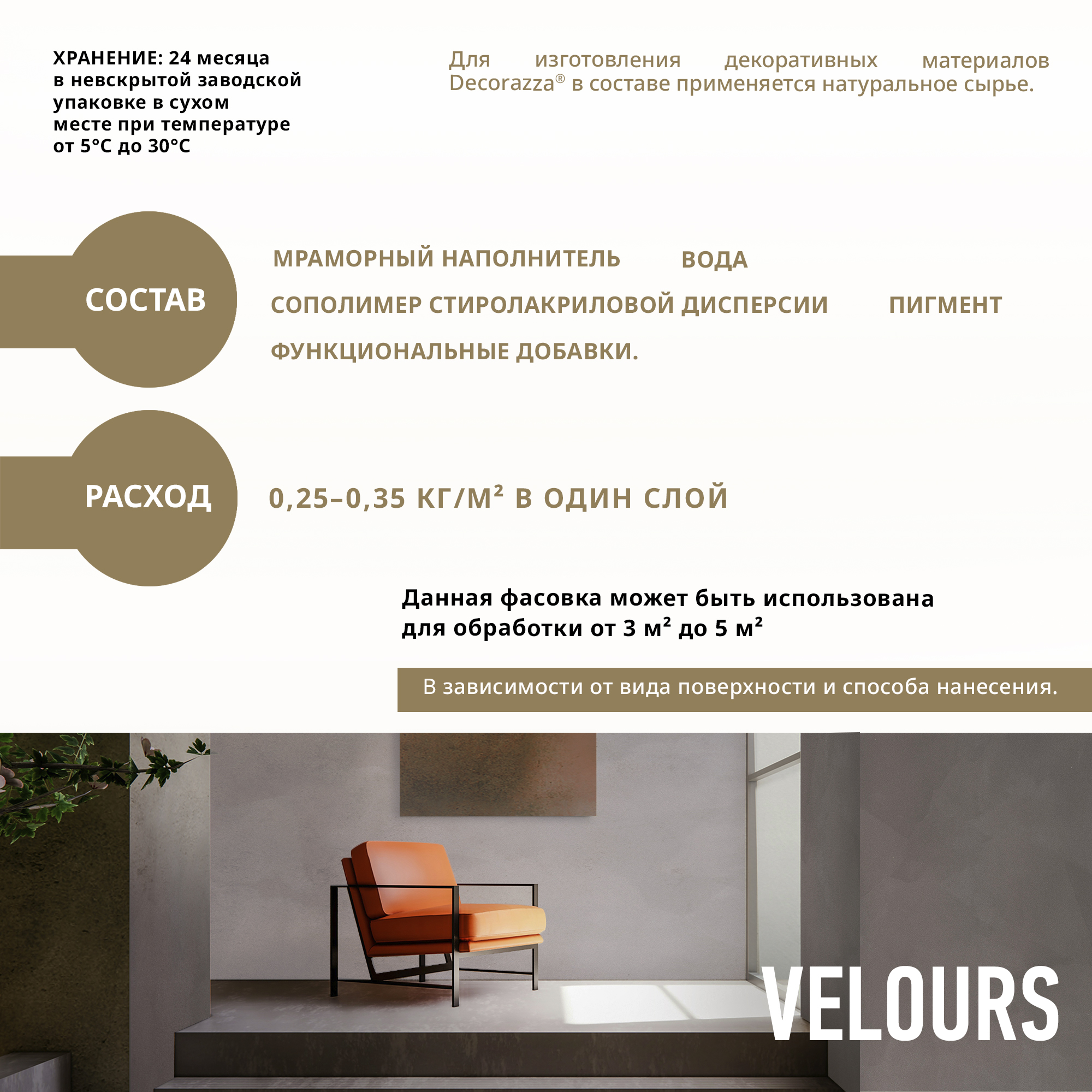 4. Перед нанесением материал VELOURS аккуратно перемешать вручную. Материал готов к нанесению. Нанесение материала следует начинать с верхнего левого угла, двигаясь к правому нижнему. Во избежание заметных стыков на поверхности всегда работайте по «мокрому краю», оставляю по краям минимальное количество материала.
