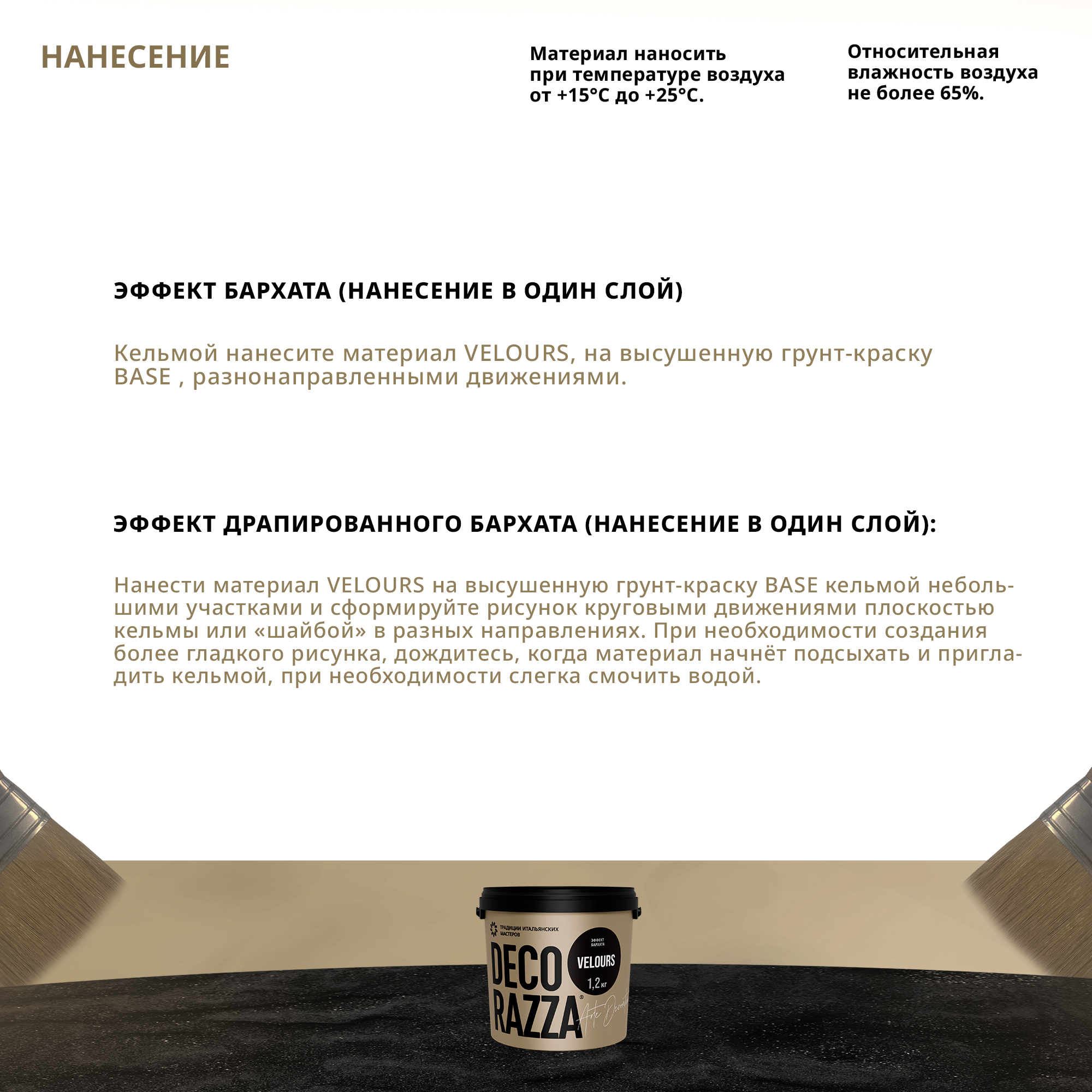 Для создания эффекта драпированного бархата (нанесение в один слой), нанести венецианской кельмой материал VELOURS, на высушенную грунт-краску BASE, небольшими участками и сформируйте рисунок круговыми движениями плоскостью кельмы или «шайбой» (круглой кельмой) в разных направлениях. При необходимости создания более гладкого рисунка, дождитесь, когда материал начнет подсыхать и пригладьте его кельмой.