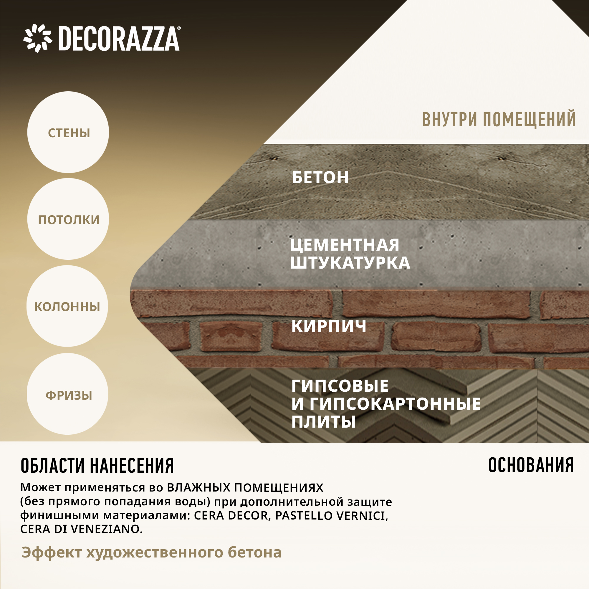Уникальность фактурного материала Decorazza Art Beton заключается в возможности формирования бесшовных поверхностей с имитацией бетона без колеровки и лессировки. За счет такой особенности процесс отделки значительно упрощается и ускоряется. Дополнительным преимуществом продукта является низкий расход — до 1 кг на квадратный метр.