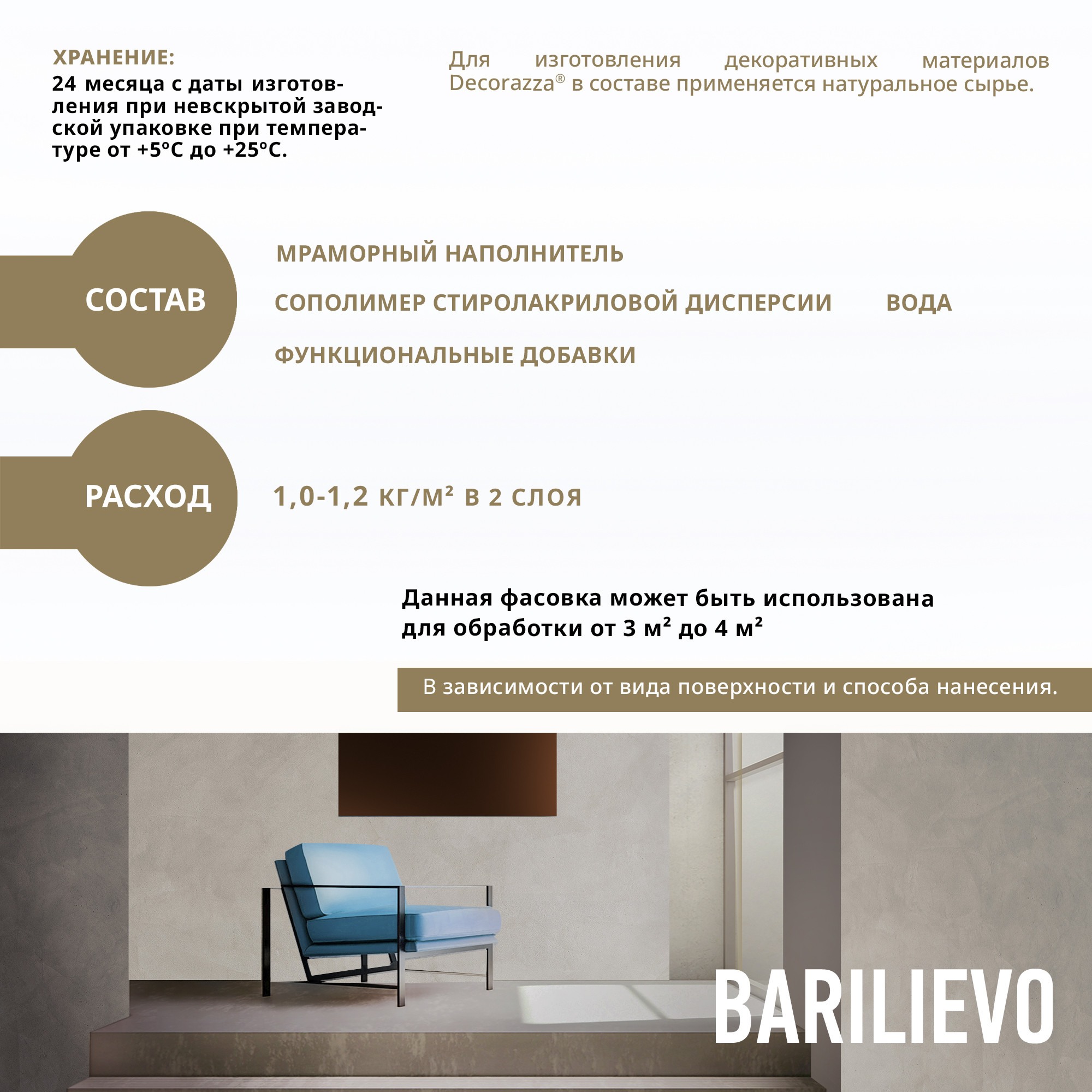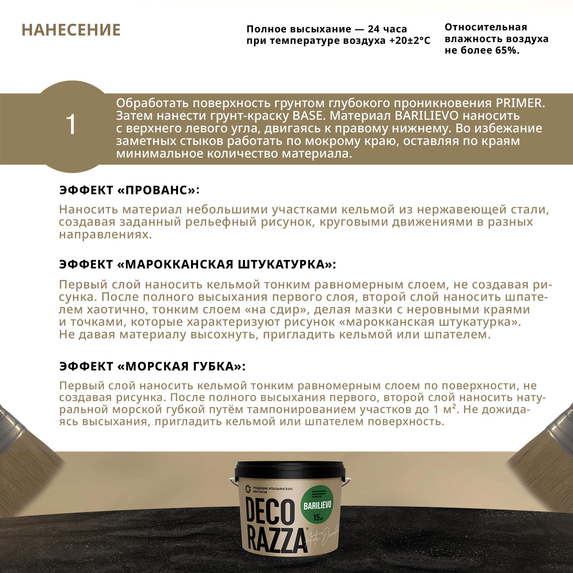 Высокопластичная декоративная штукатурка с эффектом ткани, бетона, марокканской штукатурки, металлических листов, камня и других поверхностей предназначена исключительно для внутренней отделки. Материал Barilievo обеспечивает простоту нанесения и минимальный расход за счет пластичности продукта и отсутствия необходимости идеального выравнивания основания шпаклевкой. Формирует безупречное покрытие без швов и стыков, не требующее особого ухода. Продукт подходит для отделки помещений в африканском, средиземноморском, минималистичном, гранжевом и других стилях.