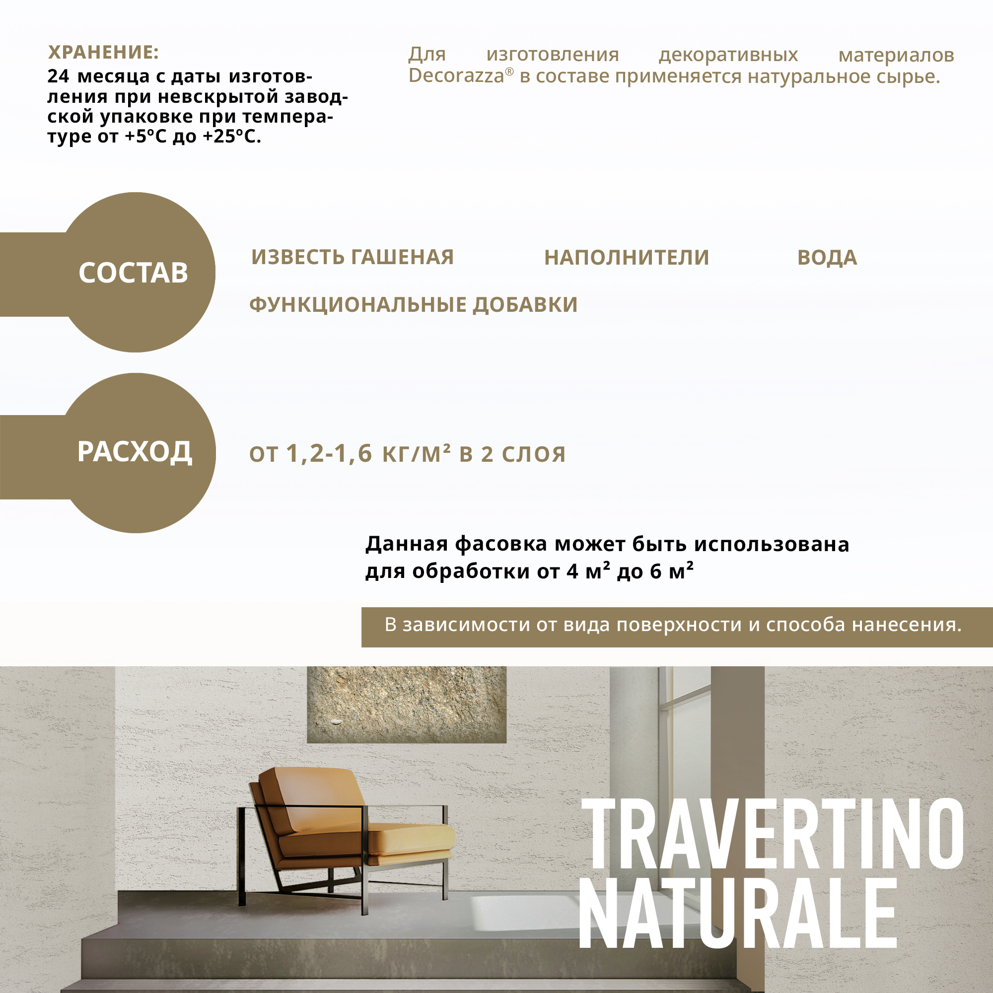 Декоративный материал Travertino Naturale с обновленной формулой уместен в роскошных античных и современных интерьерах с ярко выраженной индивидуальностью. При этом за счет экологичности и антисептических свойств состава, устойчивого к грибку и плесени, он может использоваться в любых помещениях. С помощью известковой штукатурки можно создать эффекты «Камень травертин», «Известняк» и другие.Декоративная штукатурка под кирпич, известняк, песчаник и прочие виды камня эффектно смотрится в сочетании с другими продуктами бренда в интерьерах в античном и скандинавском стиле, хай-теке, минимализме, модерне, эклектике. Известковый материал Travertino Naturale предназначен для отделки стен и потолков внутри помещений для создания паропроницаемого экологичного покрытия, устойчивого к истиранию и защищающего поверхность от появления грибка и плесени. Продукт отличает небольшой расход (1–1,5 кг/м2) и простота нанесения.