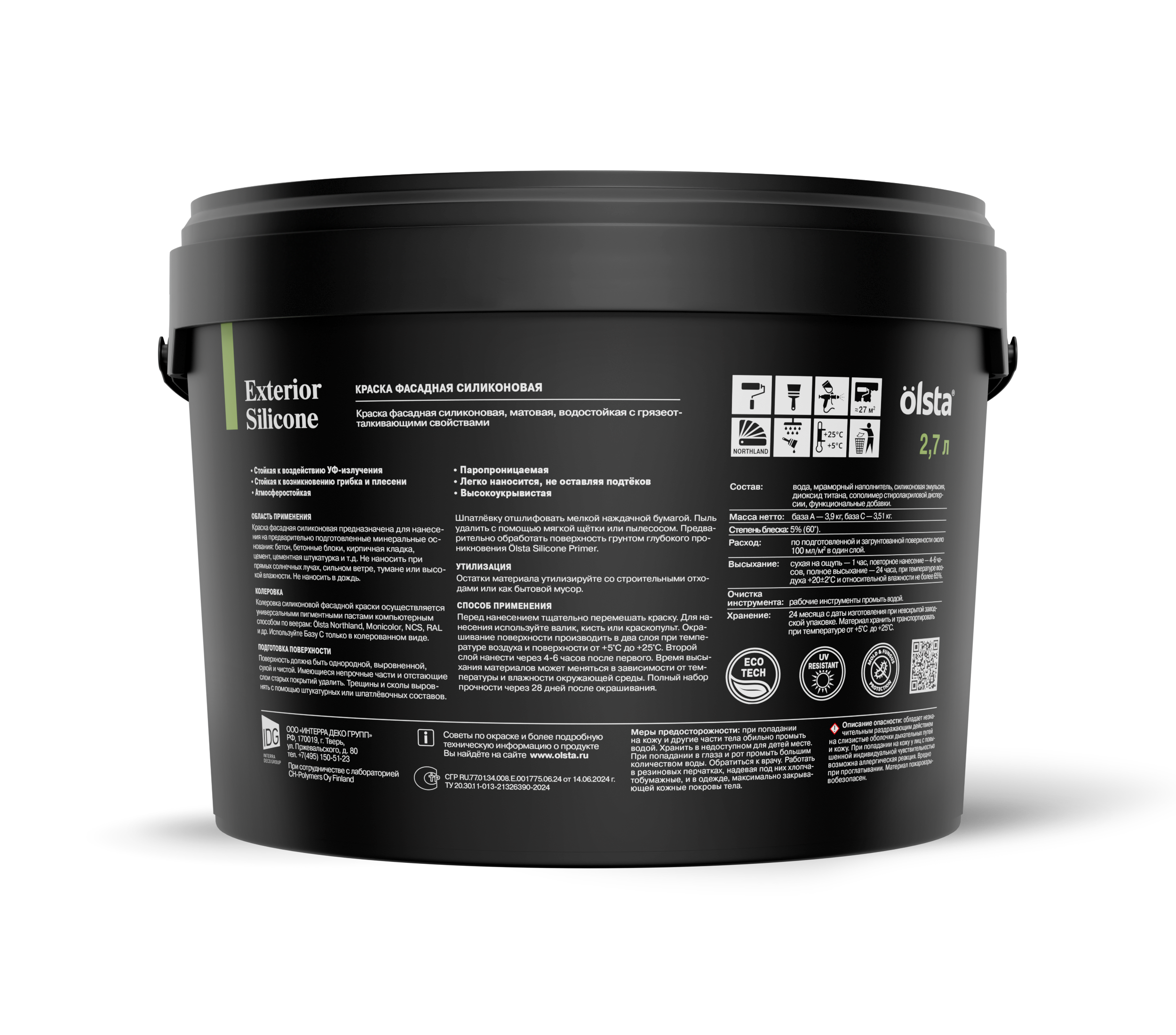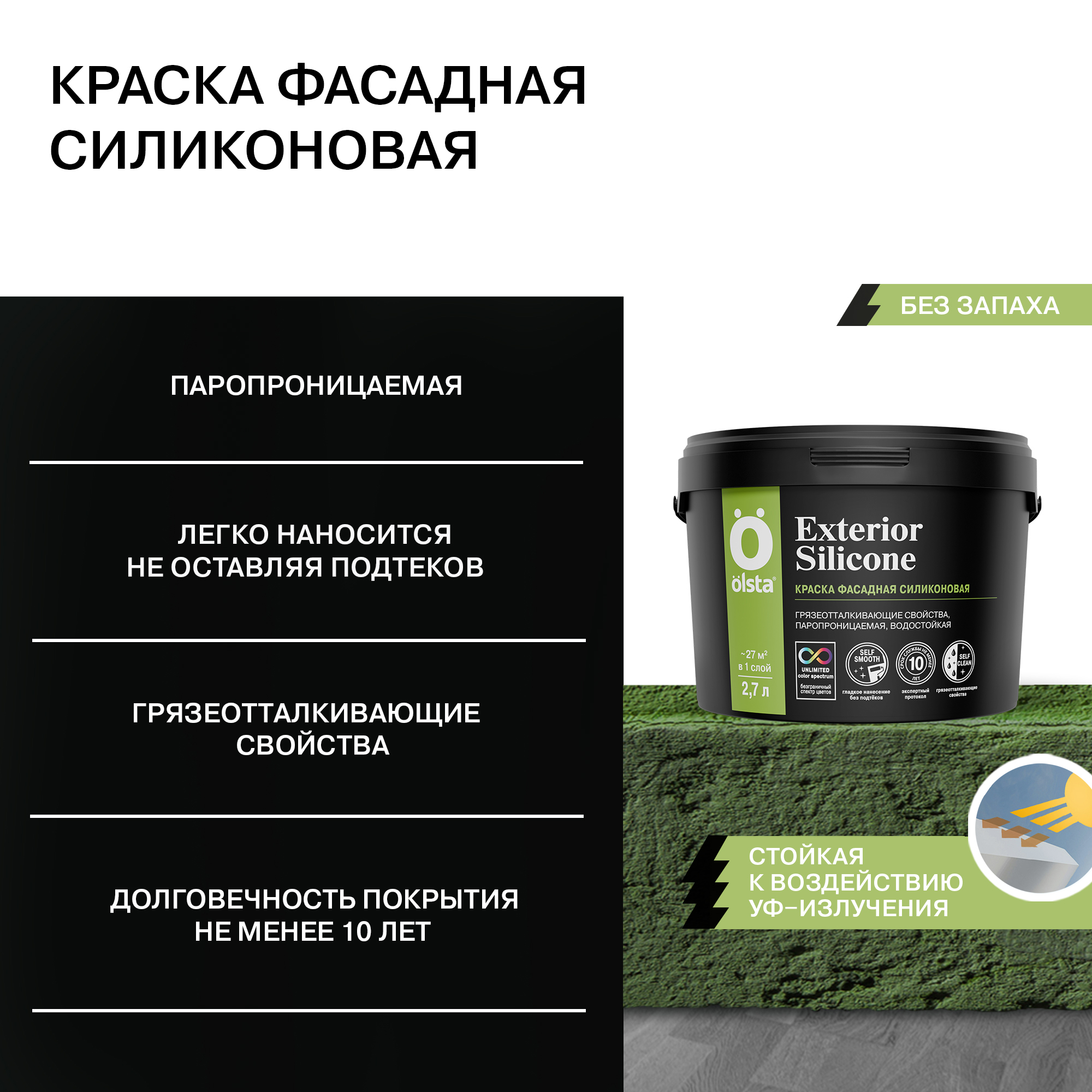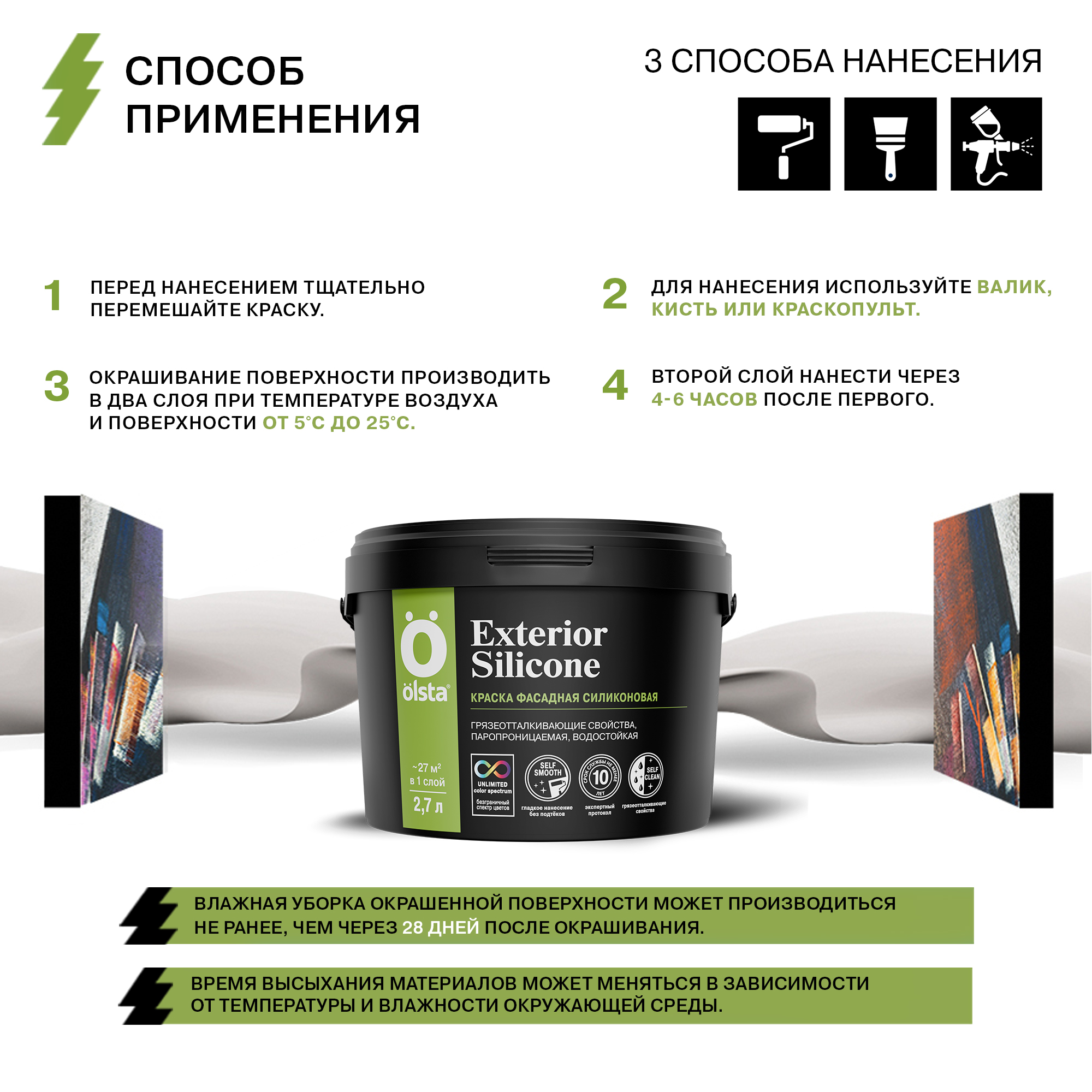 Выбирая OLSTA EXTERIOR SILICONE, вы получаете гарантию качественного и надежного покрытия, которое делает ваш дом не только красивым, но и устойчивым к любым погодным условиям.