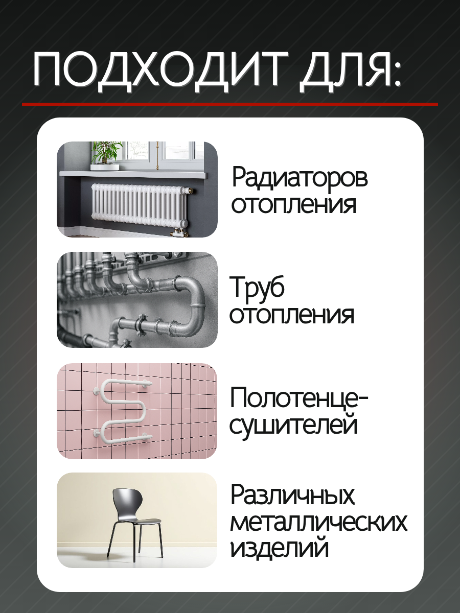 Особенностью данной эмали является наличие преобразователя ржавчины, который позволяет наносить покрытие прямо на ржавые поверхности, обеспечивая надежную защиту от коррозии без предварительной подготовки. Её полуматовый блеск придает радиаторам элегантный вид, а отсутствие запаха обеспечивает комфорт во время и после нанесения.