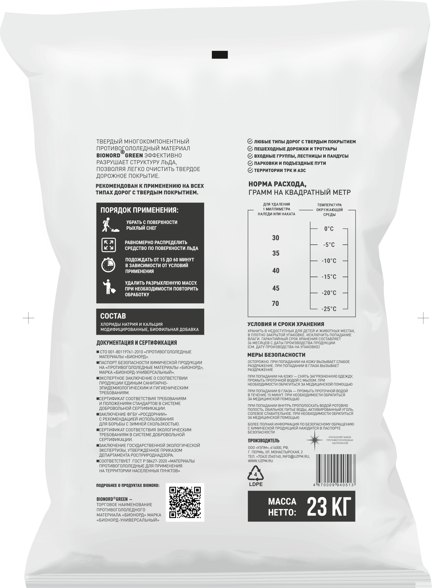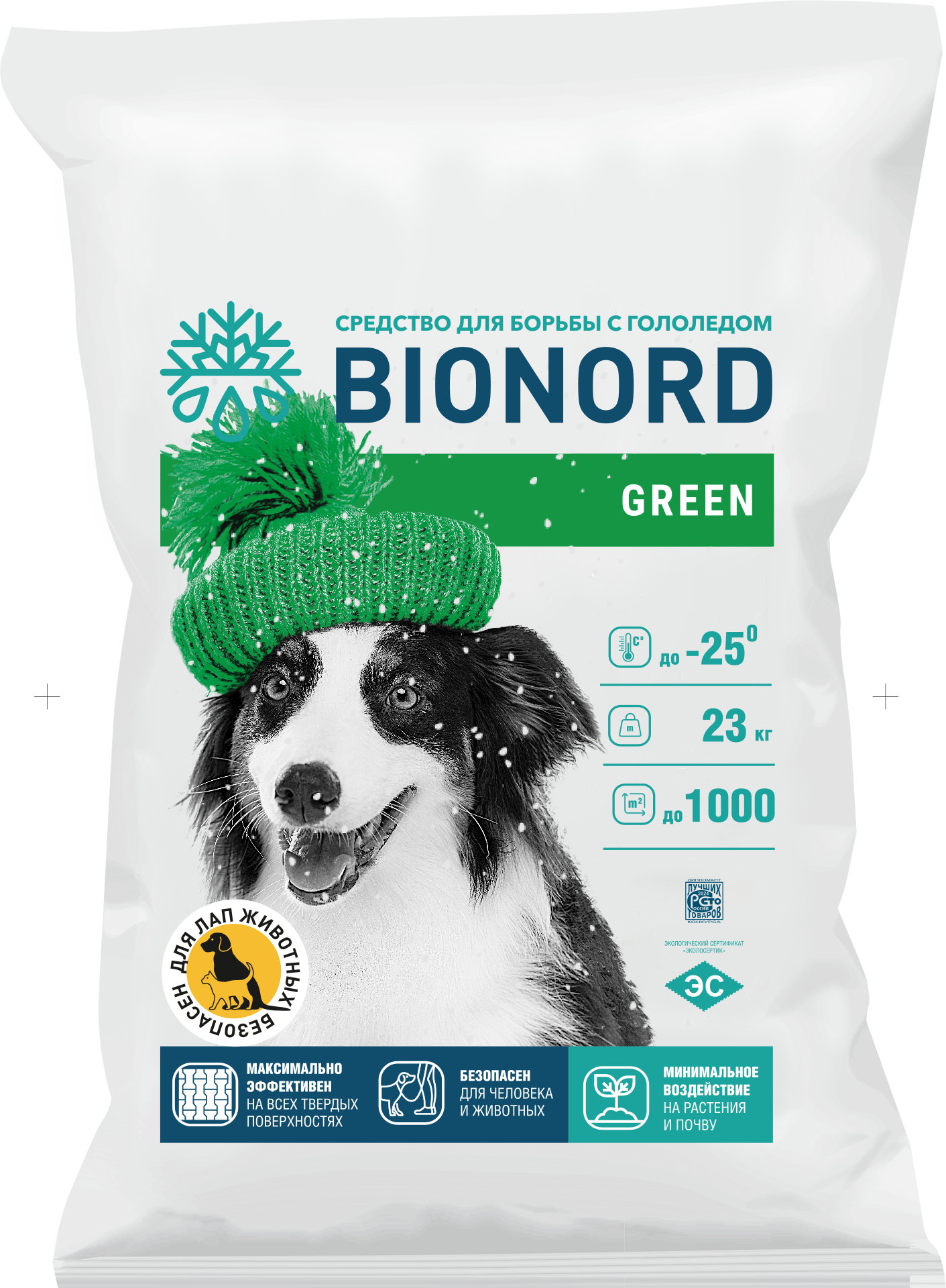 Специализированный противогололедный материал BIONORD GREEN наиболее эффективен для обработки пешеходных зон. За счёт введения в состав биофильной добавки оказывает минимальное воздействие на окружающую среду. Оптимальный выбор для использования на придомовых территориях, игровых площадках, пешеходных дорожках и в парковых зонах. Производится по передовой технологии «Единая гранула». Противогололедный материал отличается оперативным выведением из почвы и безопасностью для покрытий из плитки, камня, бетона. Экономичен: расходуется в 7 раз меньше, чем смесь песка и соли. Поставляется в мешках 12 и 23 кг, МКР 800 кг.